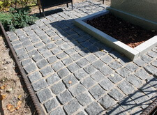 Цветник наполнили свежим грунтом, геотекстиль засыпали пескобетонной смесью, на которую и выложили брусчатку. Затем, после того, как брусчатку замыли, необходимо было некоторое время подождать окончательного высыхания раствора.