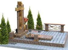 Модель памятника для места захоронения размером не более 2.5 на 2.5 метра. Памятник изготовлен из гранита и металла. Гранит выбран цветной, неоднородность вкраплений средняя. Металл в данной модели - это сталь кортеновская, прекрасный и долговечный материал, идеально подходит для создания сложных композиций на месте захоронения.